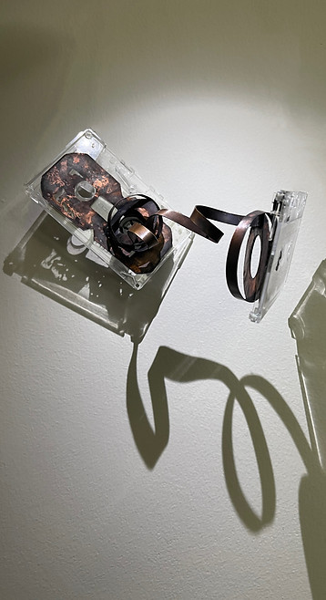 Through mixed media, I aim to evoke a sense of melancholy and reflection on the transience of technology. The cracked and faded plastic, the falling action of the cassette frozen in time, and the worn copper color serve as visual metaphors for the passage of time and the inevitable decay of once-revered objects.